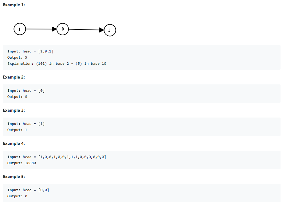 각 노드의 값이 0또는 1인 linked list의 이진표현을 10진수 값으로 구하여 반환한다.