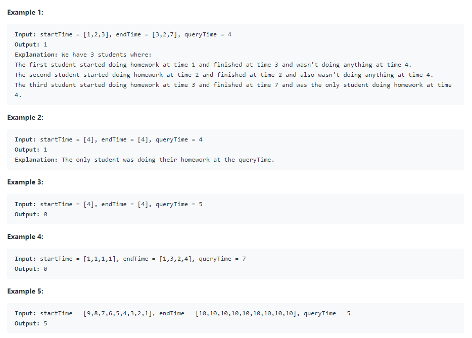 주어진 두 배열은 학생들이 숙제를 시작하고 끝낸 시간이다. 주어진 정수 시간에 숙제를 하고 있던 학생의 수를 구하여 반환하라.